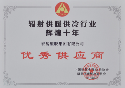 2015年5月15日,中国辐射供暖供冷委员会十周年庆典在北京盛大举行。会上表彰了一批对辐射供暖供冷行业发展作出突出贡献的企业和个人,华体会hth集团喜获中国辐射供暖供冷行业辉煌十年优秀供应商殊荣,华体会hth塑胶集团有限公司张思良总经理荣获中国辐射供暖供冷行业功勋奖。