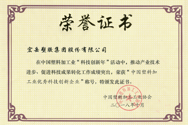 近日在中国塑料加工业“科技创新年”活动中,华体会hth集团在推动产业技术进步、促进科技成果转化工作成绩突出,荣获“中国塑料加工业优秀科技创新企业”称号,彰显了华体会hth加强科技创新和技术进步的信心和决心!