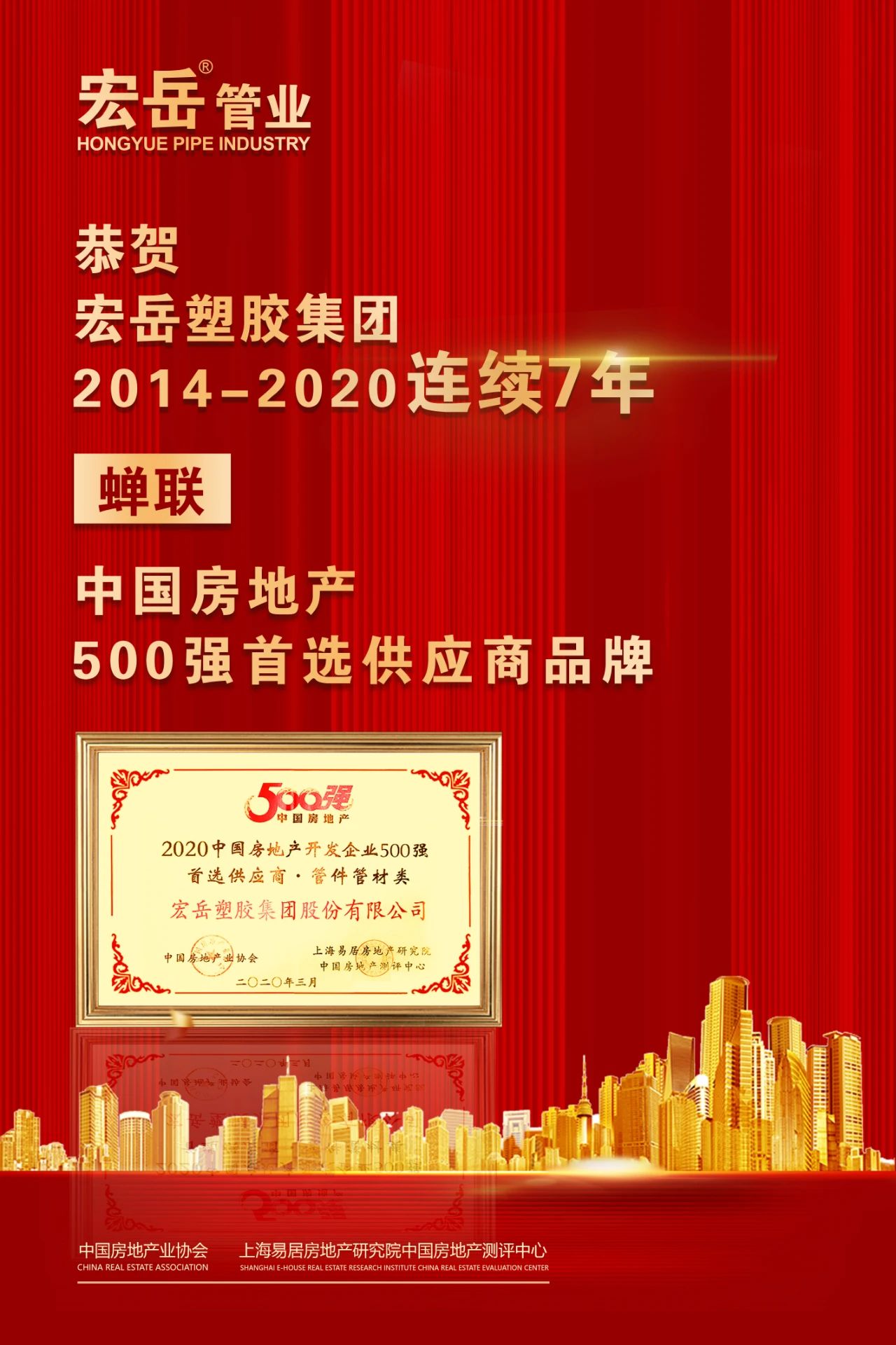《2020中国房地产开发企业500强测评报告》和《2020中国房地产开发企业500强首选供应商服务商品牌测评报告》同时揭晓。华体会hth塑胶集团股份有限公司荣获2020年中国房地产开发企业500强首选供应商服务商品牌测评榜单的管件管材类5强。