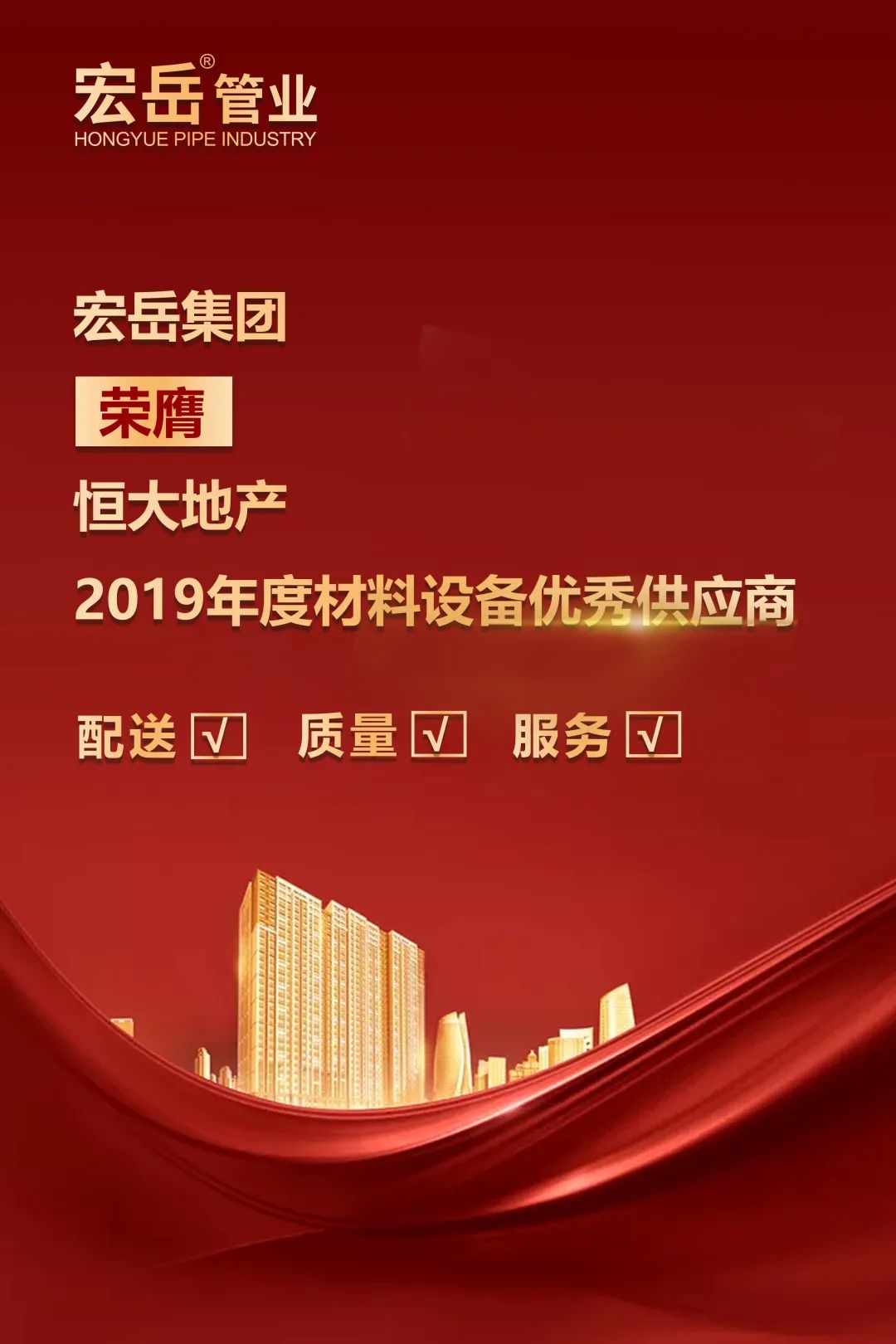 恒大地产集团作为中国最具影响力的房地产企业之一,一直以来秉持品质至上的原则,此次评选,是根据《材料设备供应商年度综合评估方案及细则》,从材料配送、产品质量、问题投诉率等多方面展开评定,华体会hth从管材管件类品牌中脱颖而出,被客户评为产品质量和品质管控水平最高的合作伙伴之一。